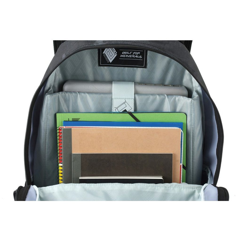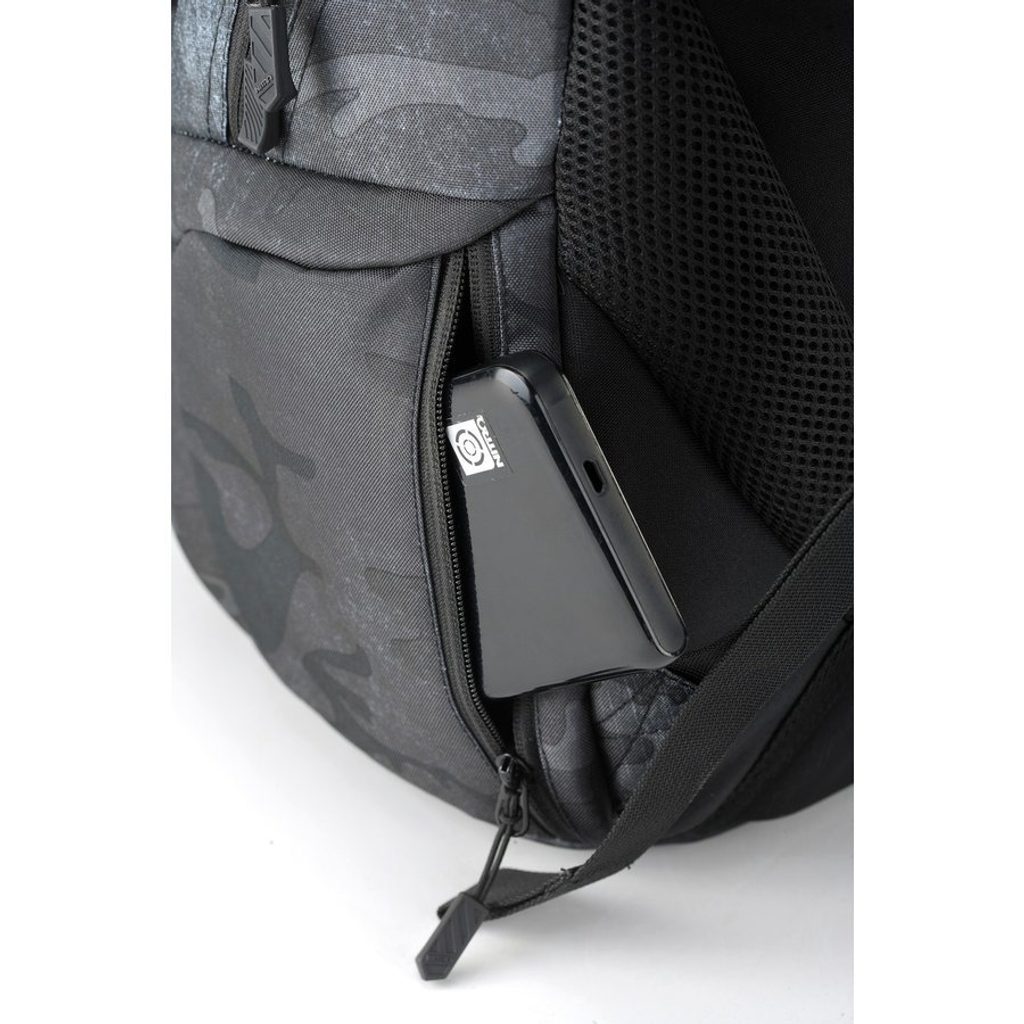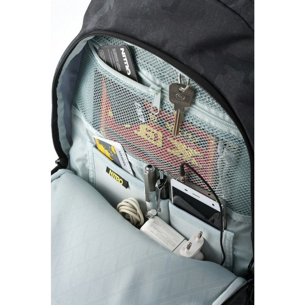 Vypolstrovaná kapsa na 15" notebook, fleecem vystlaná kapsa na brýle a podobně choulostivé věci, průchodka na sluchátka, organizér, přední termoizolační kapsa co zachová studené pití, postranní síťka na lahev.