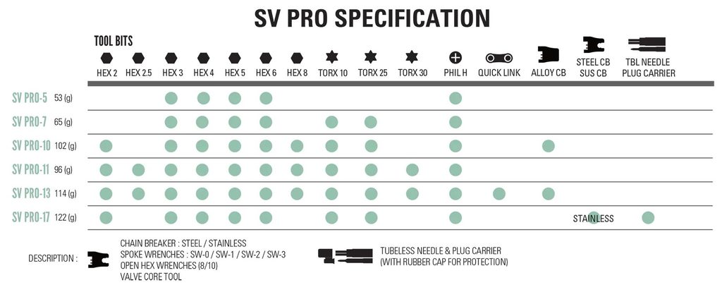 Lezyne SV Pro 17 je špičkový cyklistický multiklíč, který kombinuje vysoce odolné nerezové ocelové bity s ergonomickými CNC obráběnými hliníkovými bočnicemi. Díky rozšířené sadě 17 funkcí zvládneš vše od běžných oprav až po komplexní údržbu kola – ať už jsi MTB, gravel nebo silniční jezdec.