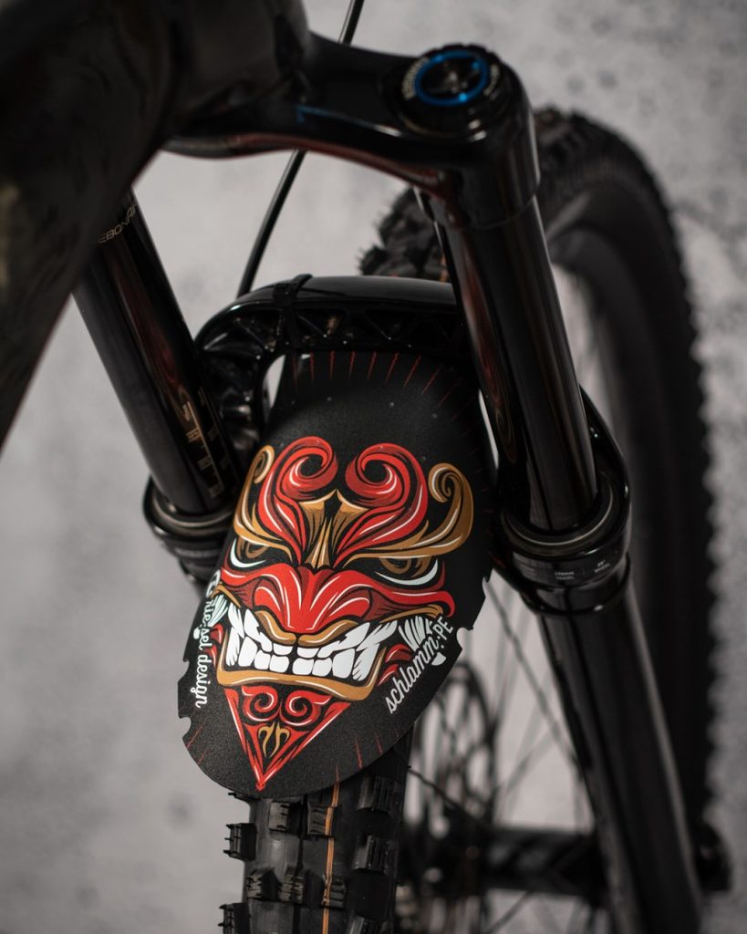 Cool designový Rie:sel a hlavně funkční blatníček na vidlici a zadní stavbu. Větší bráška od Schlam:PE - delší o "nos". Upevnění pomocí stahovacích pásek. Odolný proti poškrábání.