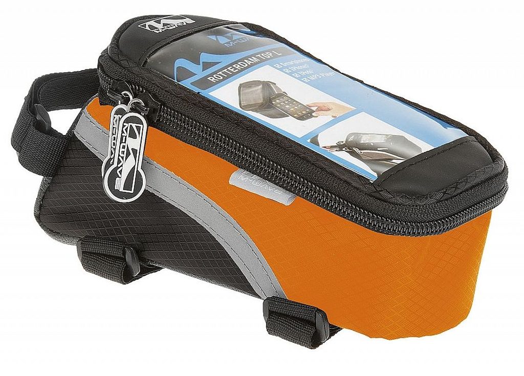 Brašna na horní rámovou trubku, voděodolná, uchycení - 3x suchý zip, kapsa s okénkem na smartphone, reflexní prvky, černá, 17 x 8 x 8 cm
