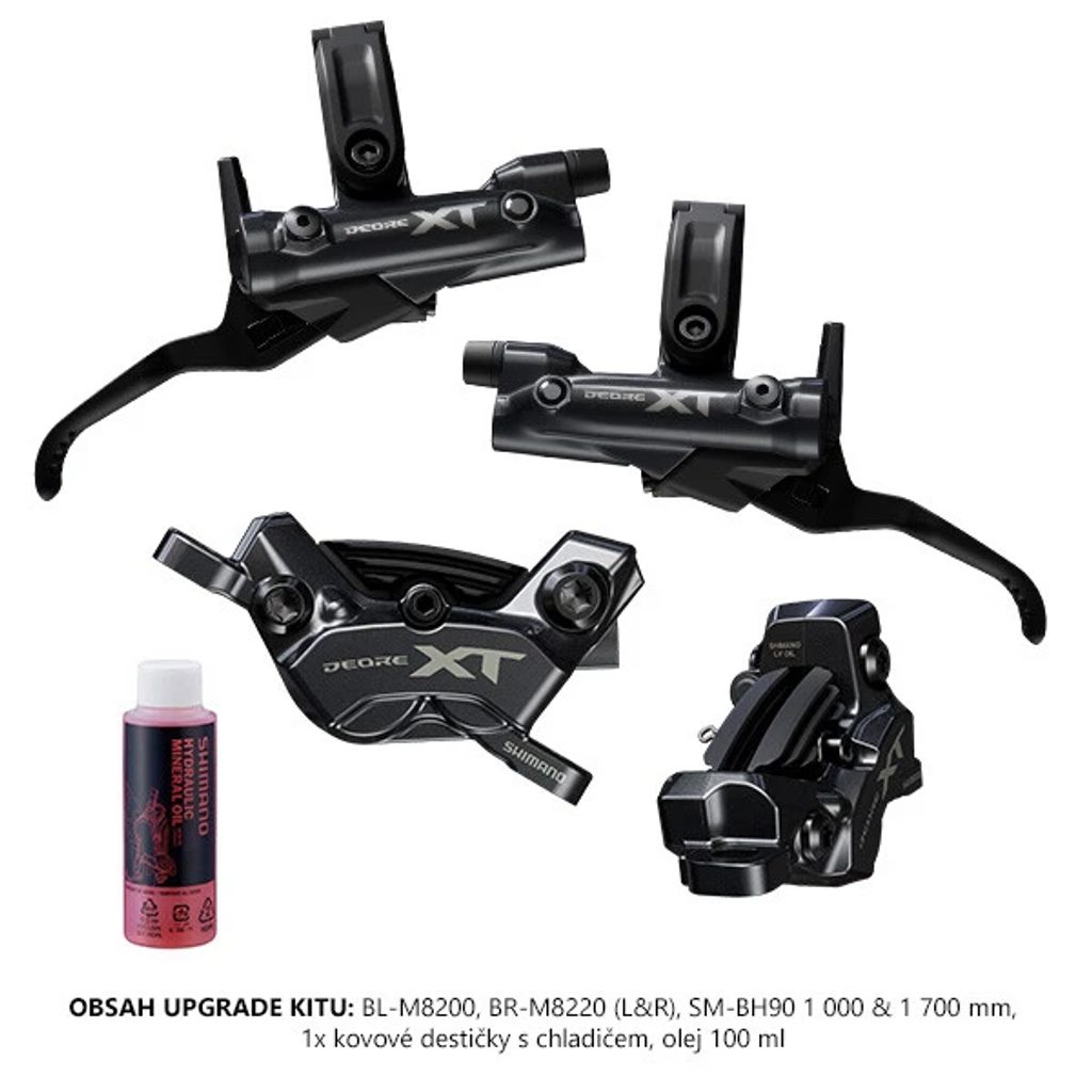 Podle uvedeného balení sada obsahuje brzdové páky BL-M8200, třmeny BR-M8220 pro přední i zadní brzdu, hadice SM-BH90 v délkách 1000 a 1700 mm, 1× kovové destičky s chladičem a minerální olej Shimano 100 ml.